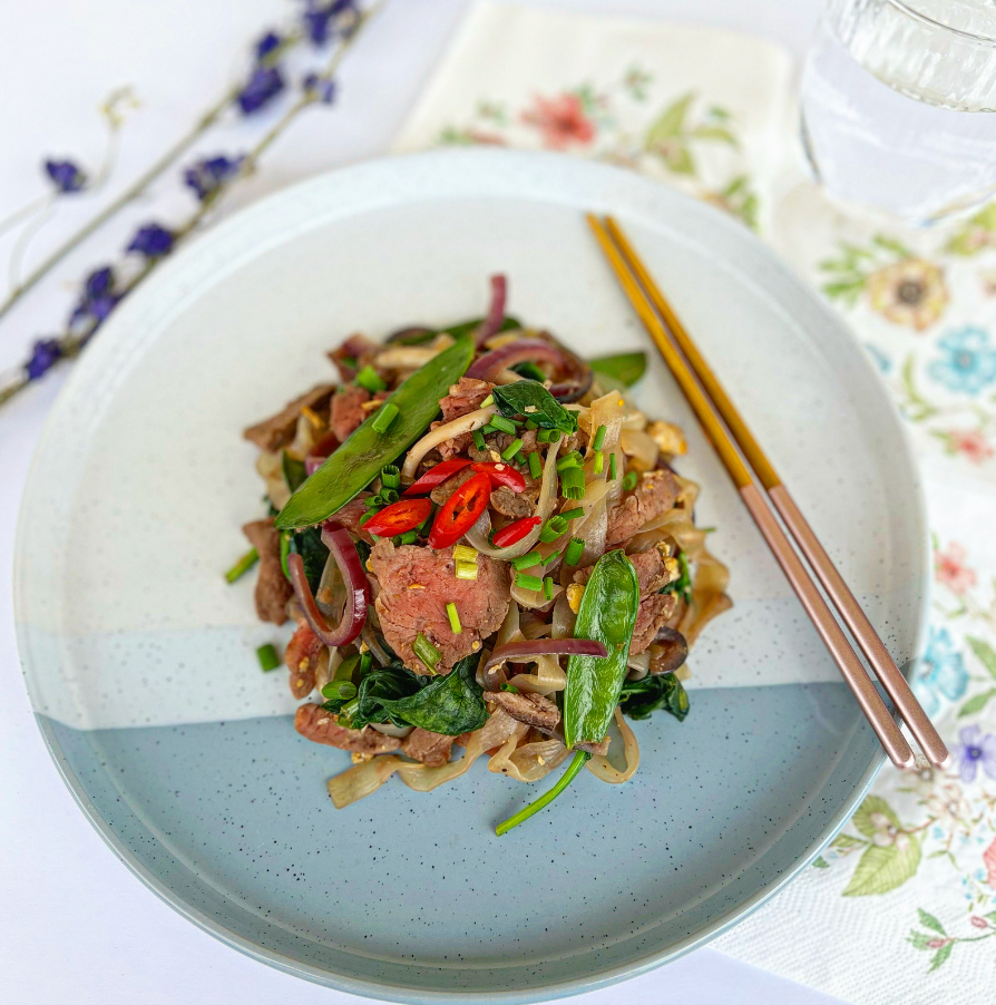 2) Add red onion and scallions to skillet with steak. Cook 2 minutes longer. Reduce heat to medium. Begin adding ingredients for sauce. Add spinach and pea pods. Continue to cook another minute.