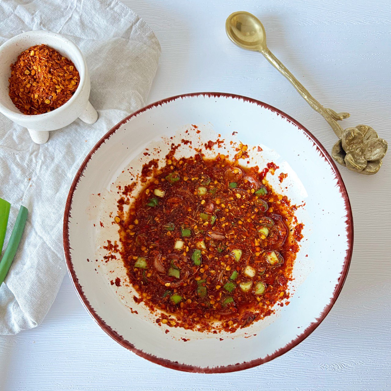 4) Add the chilli flakes or fresh chilis chopped spring onion, and sliced shallots and mix with a spoon. Enjoy the sauce with your main dish!